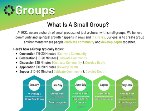 Our groups follow an annual rhythm that helps you grow spiritually and connect relationally while balancing everyday life. This rhythm creates space for meaningful relationships, spiritual growth, and opportunities to invite others into community. Each group is led by a trained facilitator, with members who commit to meeting regularly to encourage one another and grow together. We’ll provide the tools to help you build friendships, develop depth in your life, and have a great group experience.